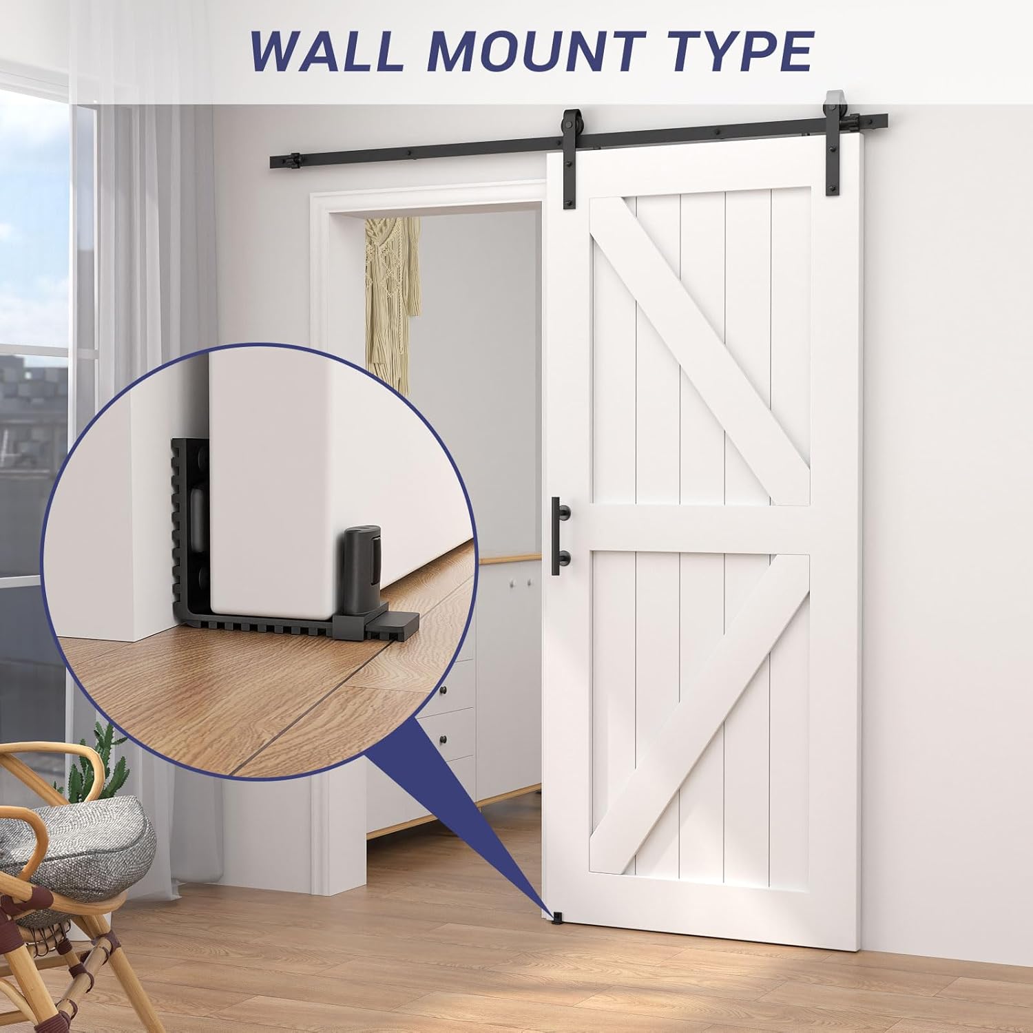 Wandmontage-Typ und bündiges Design mit flachem Boden, keine Notwendigkeit, Löcher auf Ihrem Boden zu bohren. Unsere Scheunentor-Bodenführung enthält auch notwendiges Zubehör für die Installation